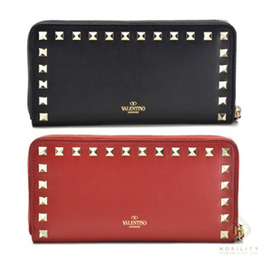 발렌티노 락스터드 지퍼 가죽 장지갑 블랙 & 레드 |
